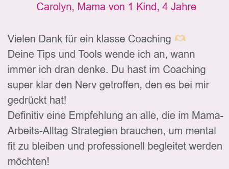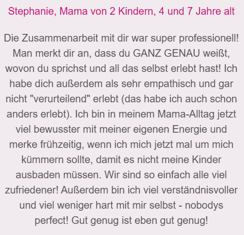 Diese Mamas konnten durch die Zusammenarbeit mit mir mehr Gelassenheit in ihren Alltag bringen und können nun die wertvolle Zeit mit ihren Kindern bewusster genießen: